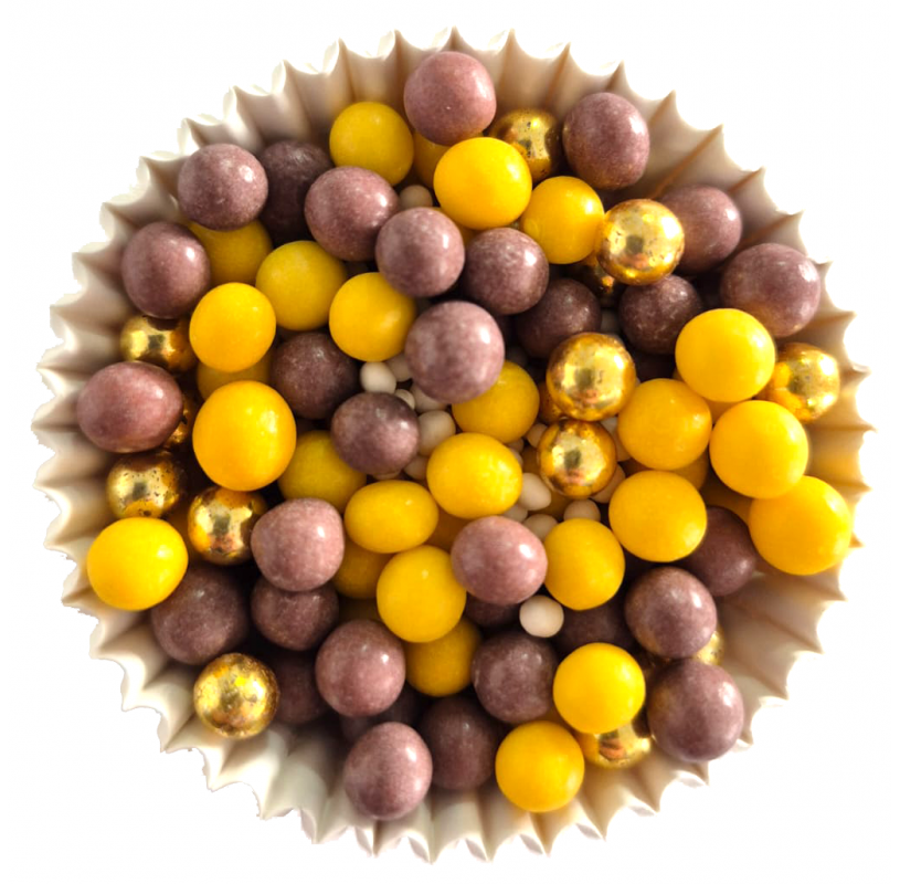 DELUXE ALBA DORATA è un raffinato mix di granella di zucchero composto da sfere e decorazioni in tonalità oro, giallo e bronzo, perfetto per impreziosire dolci e dessert con un tocco elegante e luminoso.