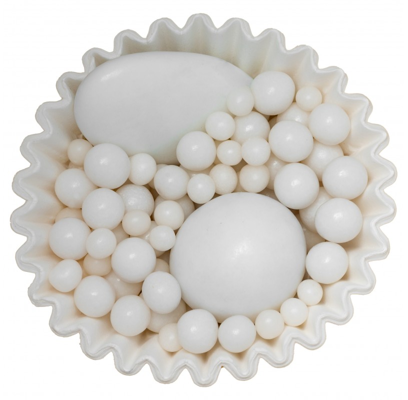 Confetti al cioccolato e sfere bianche di diverse dimensioni, dalle finiture lucide ed eleganti. Ideali per cerimonie, matrimoni e creazioni di cake design raffinate.